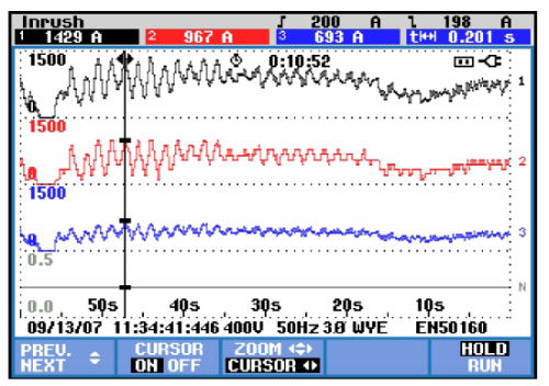 上圖中上半部分顯示的是使用快速HTEQ系統的補償效果。當負載電流突然增加時,快速HTEQ在20ms內投入所需要的全部電容器,總電流明顯減小;當負載切除時,快速HTEQ又在20ms內切除相應全部電容器。