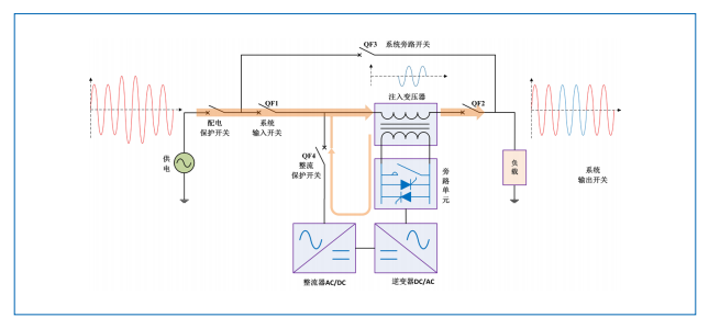 HTAVC 時刻監測輸入側電源電壓,一旦發生電壓暫降或暫升,控制單元控制逆變器向串聯的注入變壓器注入適當的補償電壓,快速將負載端電壓調節到額定值,從而減少來自電網輸入端的電壓暫降、暫升等對負載的影響。