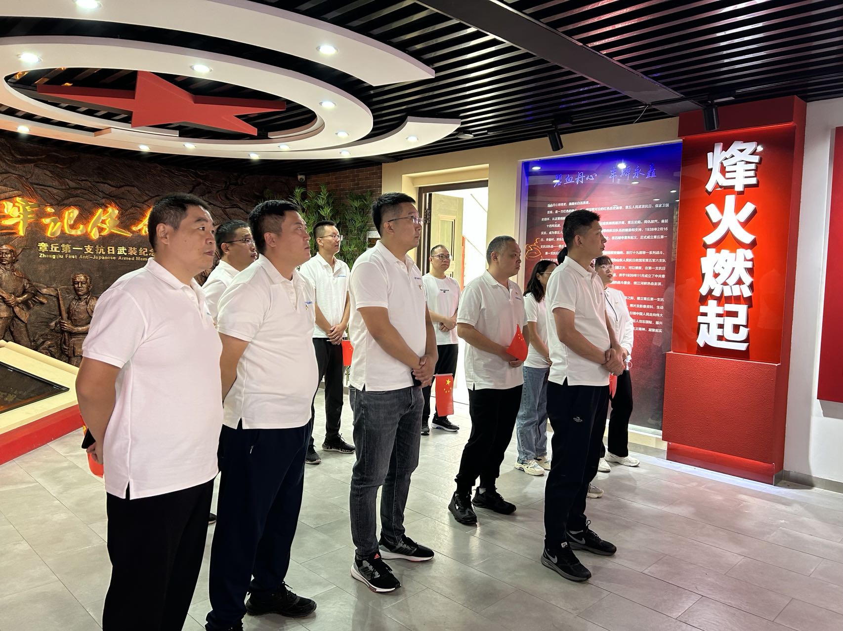 章丘第一支抗日武裝革命紀念館紀念館位于章丘區普集街道三山峪村,章丘第一支抗日武裝——章丘人民抗日救國軍就誕生在這里,被稱之為“章丘的井岡山”。在講解員的引領和解說下,大家參觀學習了烽火燃起、救亡圖存、浴血奮戰、精神豐碑、薪火相傳等五個展廳,觀看了抗日英雄紅色影像。紀念館用珍貴詳實的歷史文物、照片及影像資料,生動再現了在民族危難關頭,中國共產黨人勇立潮頭,高舉抗戰旗幟,引領中國人民走向偉大勝利的光輝歷史。李曼村、宋怡翔、方子成等革命先輩為了國家的生死存亡,為了實現革命理想不惜犧牲一切的愛國主義情懷和大無畏精神深深感動、激勵著在場的每位同志。